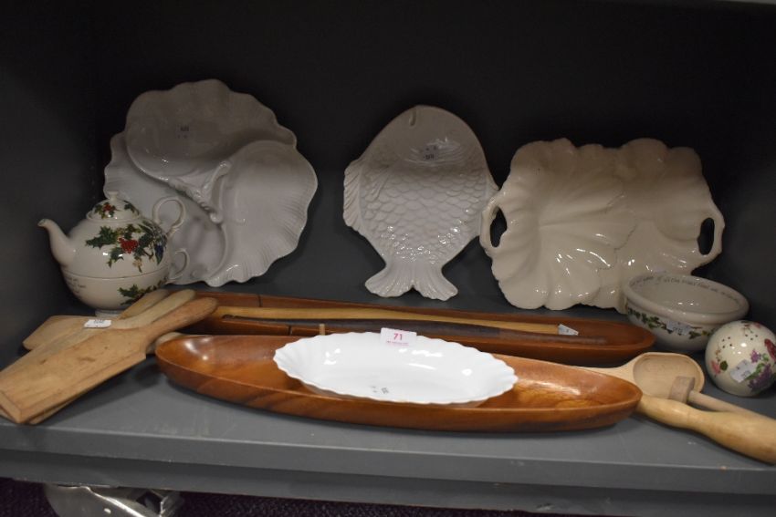 A selection of mixed treen and cermics including butter pats, Portmeirion, Spode and more.