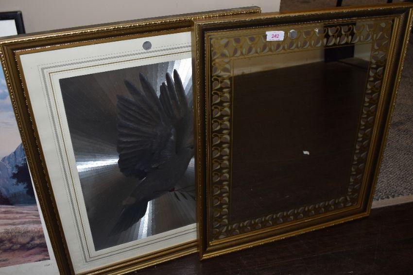 A retro wall mirror having leaf motif to border and a framed dove foil picture.