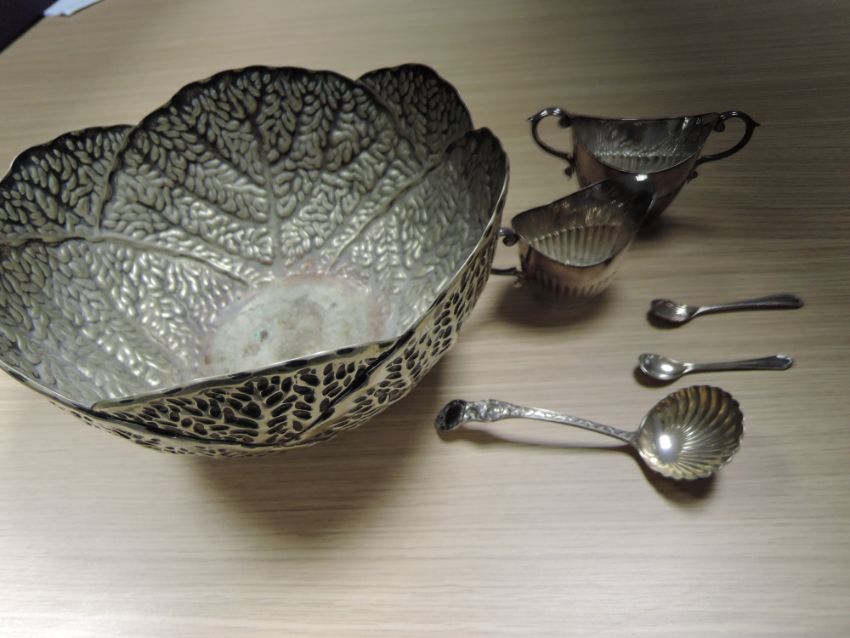 A silver plated salad bowl in the form of a lettuce, a plated sugar bowl and cream jug etc