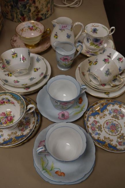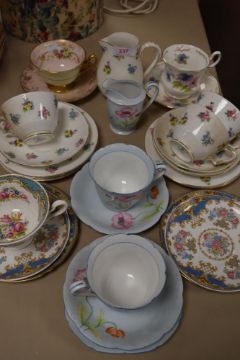 A miscellany of cups and saucer and two jugs including Shelley, Crown Staffordshire and Noritake.