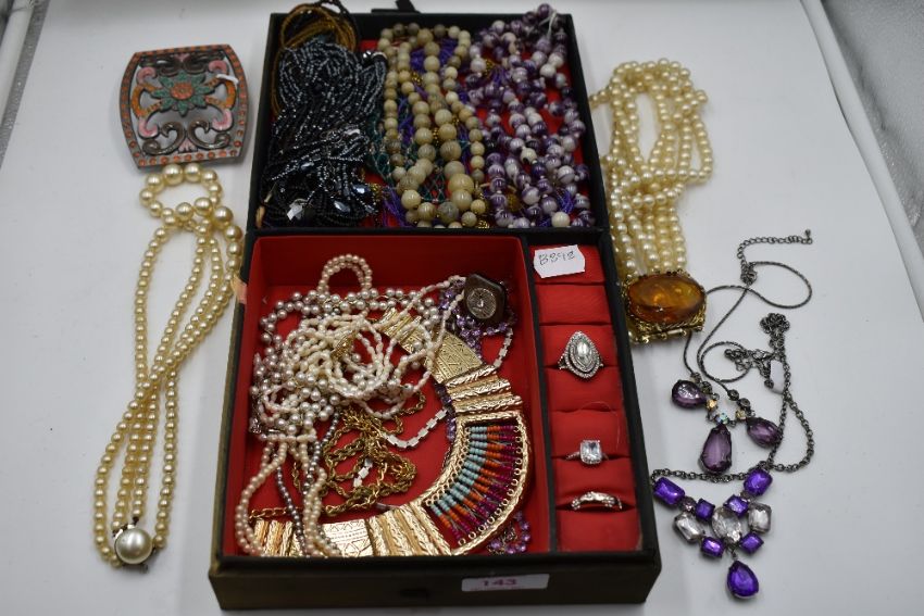 A material covered jewellery case containing a selection of beaded necklaces, strings of simulated pearls and beads, buckle, rings etc
