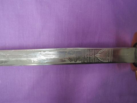 A possible 18th/19th century Small/Court Sword with leather and metal scabbard, brass hilt with wired grip, highly decorated on both sides of blade with foliage, drums, flags and cannon, blade length 76cm, total length 90cm