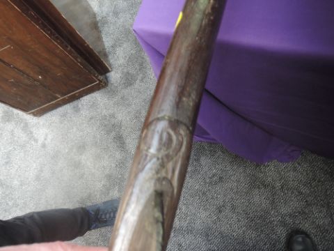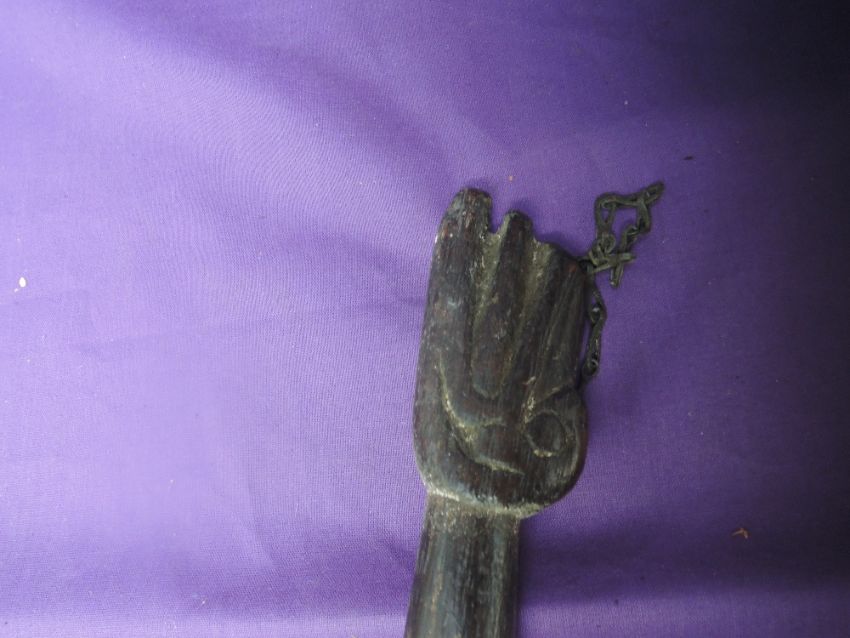 An antique possible Polynesian ceremonial paddle having carved decoration on paddle stem and mythical creature head decoration to handle, length approx 156cm