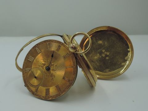 A Victorian key wound 18ct gold pocket watch no:14583 having Roman numeral dial and subsidiary seconds to engraved gold face in an engine turned case, London 1859, GW approx 75g, in original box retailed by Bell & Atkinson of Lancaster, glass broken and minute hand missing