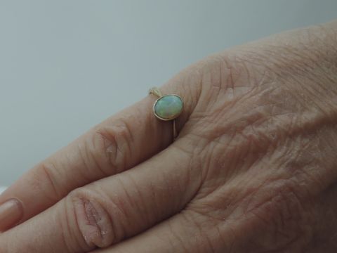 A lady's dress ring having an oval opal in a collared mount on a rose gold loop stamped 9ct, size I