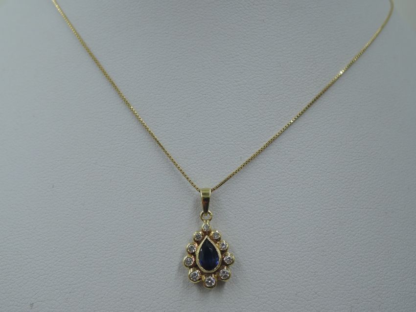 A sapphire and diamond teardrop cluster pendant in a yellow metal mount, marks worn, probably 18ct on an 18ct gold chain, approx 16'