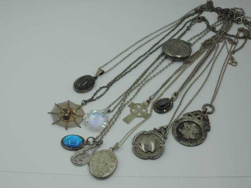 A selection of HM silver and white metal pendants stamped 925/sterling including agate, lockets, crystal, spiders web, Celtic Cross etc