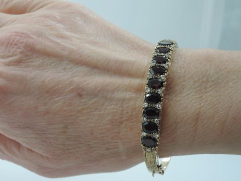 the bangle is in good condition and there is no evidence of any visible cracks or repairs. some garnets have tiny abrasions to their cut edges which can be seen under a loupe and some claws may need attention.