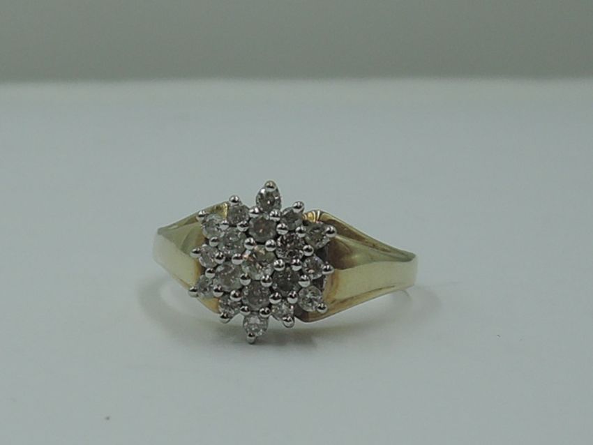A lady's dress ring having a diamond chip triple cluster in a stepped mount to shaped shoulders on a 9ct gold loop, size O