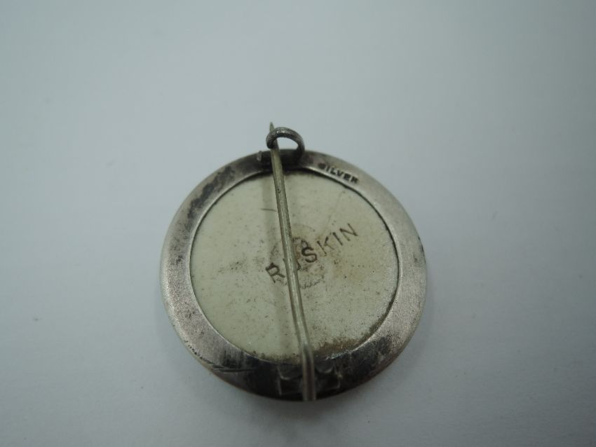 A lady's Art Deco style dress ring having a blue paste stone within a clear paste square border in a white metal basket mount on a yellow metal loop stamped 9ct & silver, size O/P with a matched Edwardian style pendant having central blue paste stone with a duo of knife bar drops with blue and clear paste stones on a white metal fixed chain, and a turquoise ceramic brooch within a white metal border stamped Ruskin/Silver