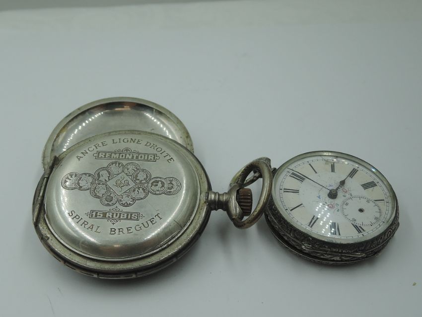 A Swiss white metal top wound pocket watch bearing Hahn mark to mechanism, having Roman numeral dial with subsidiary seconds to white face with ornate pointers. Outer case having ornate decoration with yellow metal cartouche to front and Equine interest to reverse, and a small continental silver key wound pocket watch having Roman numeral dial with subsidiary seconds to decorative face in an extensively engraved case, both AF