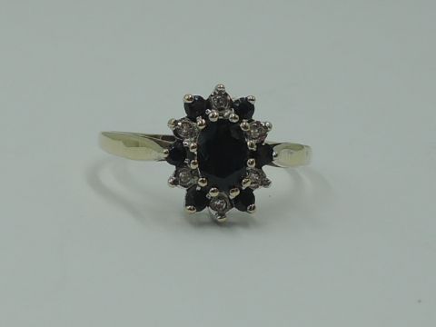A lady's dress ring having an oval sapphire and diamond chip cluster on a 9ct gold loop, size N