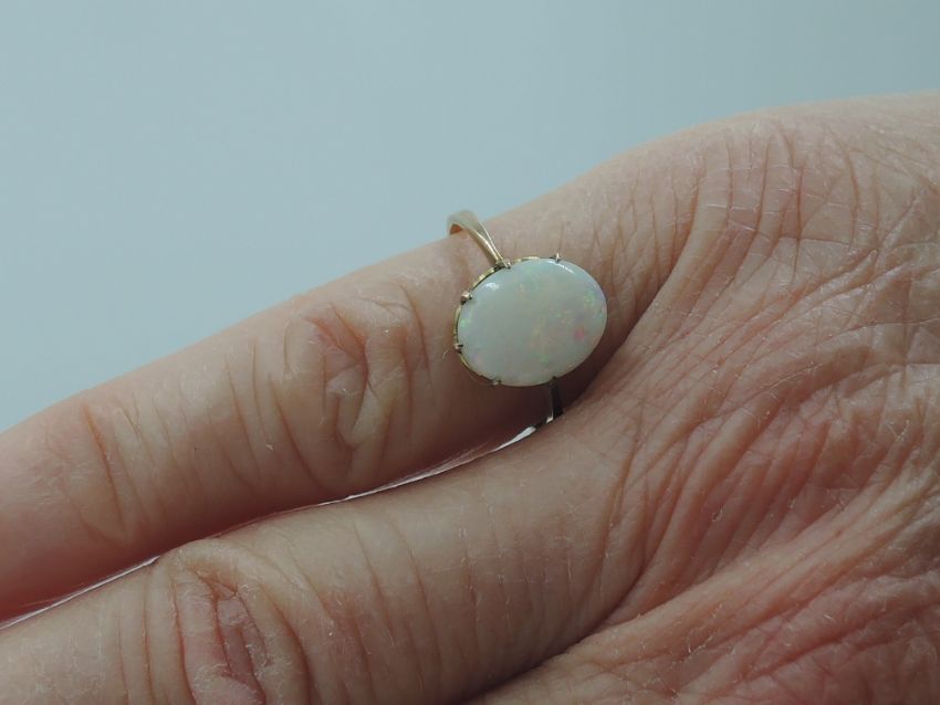 A lady's dress ring having an oval opal in a claw set mount on a rose gold loop tested as 9ct gold, size M