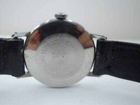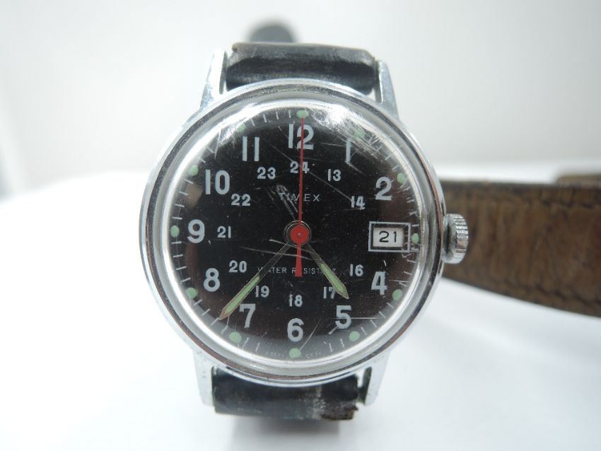 A vintage Tissot Seastar wrist watch having Arabic numeral dial, steel case and leather strap, and a vintage Timex military style wrist watch having Arabic 24hr numeral dial and date aperture to black face in steel case on leather strap
