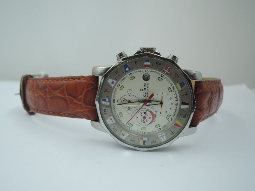 A gent's automatic wrist watch in the Corum Admiral style having a baton numeral dial with three inner dials and an outer besel with nautical decoration to a steel case with skeleton back and leather strap