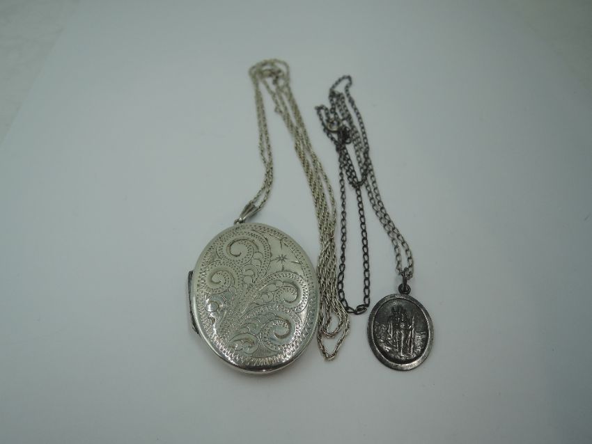 An oval white metal locket stamped silver bk & fnt having engraved scroll decoration on a white metal chain stamped sterling approx 26' & a white metal St Christopher pendant stamped silver on a silver chain