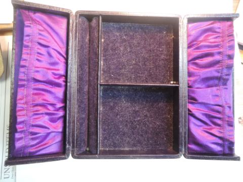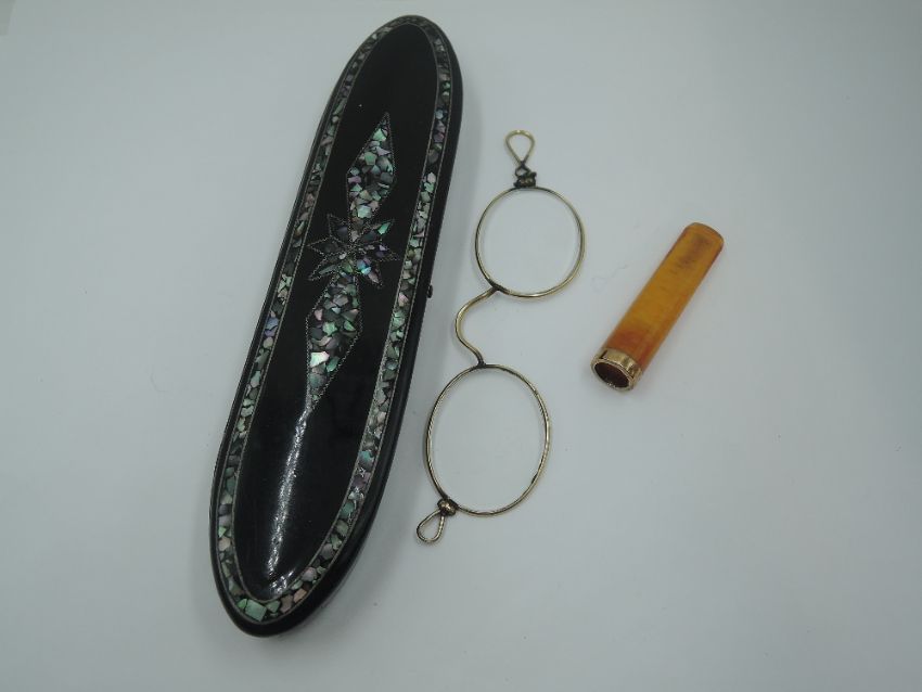 A vintage travel jewellery case containing strings of beads including mother of pearl and seed pearl, black bead muff chains, amber style cigarette holder with yellow metal mount stamped 900 and a Victorian black papier mache glasses case having mother of pearl decoration and containing a pair of rolled gold spectacles