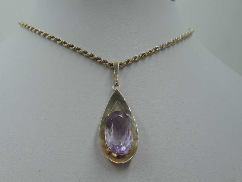 A large amethyst pendant in a yellow metal tear drop shaped open mount stamped 9ct on a 9ct gold rope chain, approx 24' & 21g