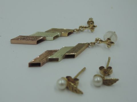 A pair of three coloured yellow metal stud earrings bearing worn marks to posts and a pair of yellow metal and seed pearl earrings