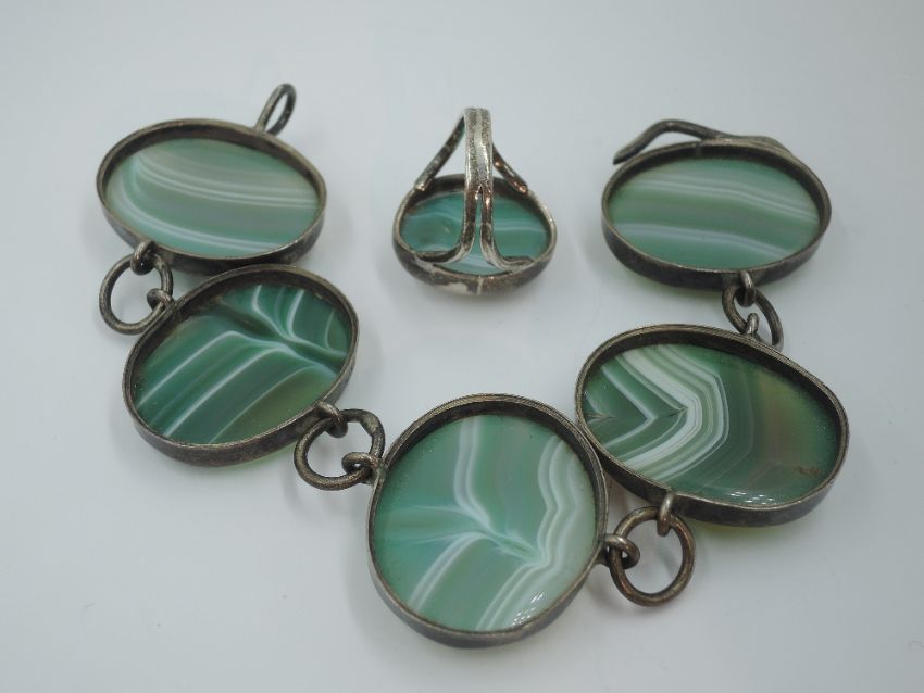 A green stripe agate bracelet having five oval panels in white metal mounts with chain links, no marks tested as silver, with a matching ring size M