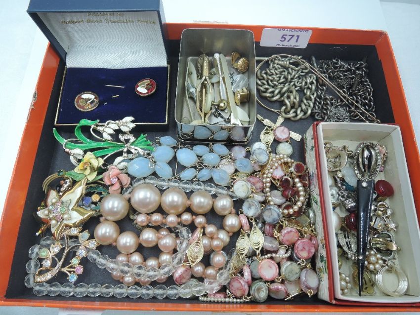A small selection of vintage costume jewellery including brooches, watch chains, clip earrings, tie clips, rolled gold glasses frame etc
