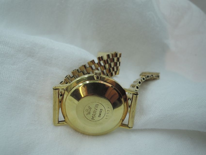A gents Marvin automatic 18ct gold wrist watch,no:90837, having a baton numeral dial with date aperture to circular face on a 9ct gold brick effect bracelet strap