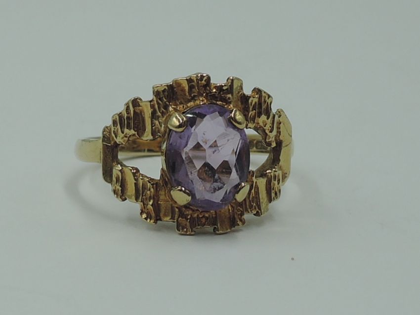 A lady's dress ring having an oval amethyst in a stylised open mount on a 9ct gold loop, size N & approx 3.3g