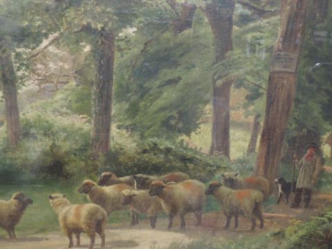 An oil painting, R Bevis, Shepherd and flock, with woodland country cottage, 50 x 74cm, plus frame and glazed