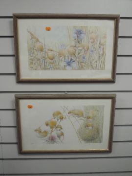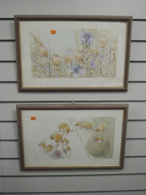 A pair of Ltd Ed prints, after Geldart, fieldmice, signed and num 203 & 256/750, 25 x 40cm, plus frame and glazed