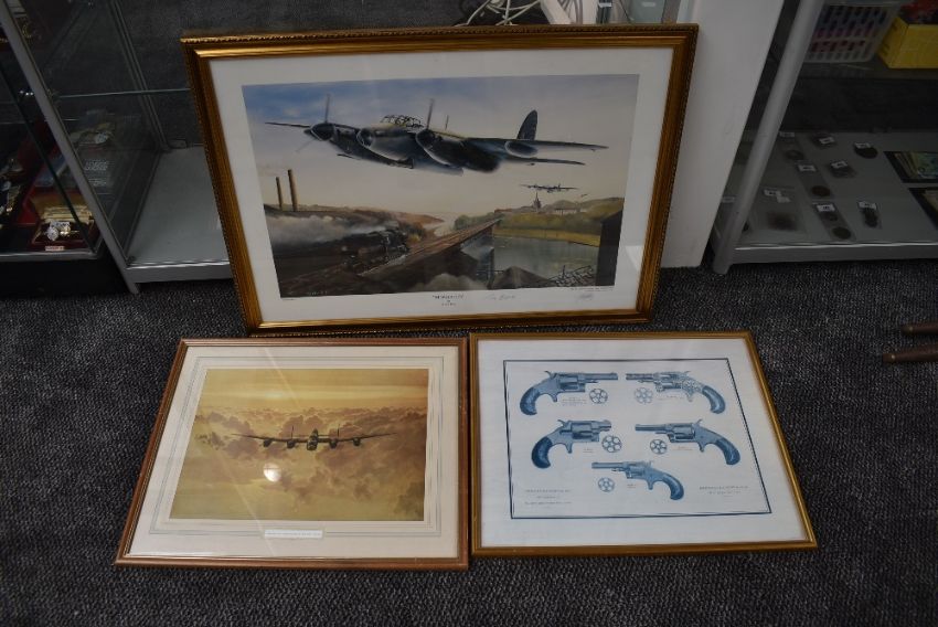 Three framed prints, after Keith Hill, Mosquito's, limited edition 117/150, bearing signatures, unnamed Outbound Lancaster Crossing The East Coast and Mervin Hulbert & Co Revolvers