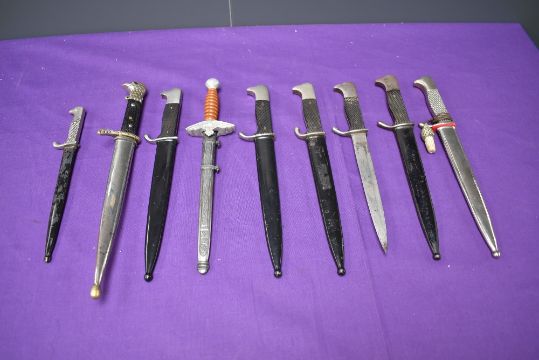 A collection of 9 miniature German Bayonets, six are miniature WW2 Dress Bayonets, one miniature Luftwaffe bayonet marked Solingen D.R.G.M one having ornate eagle head, one has portepee knot, eight with scabbards