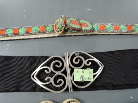 some loose beading to beaded belts, slight scuffs/wear to black grosgrain belt, gold tone belt in good order.