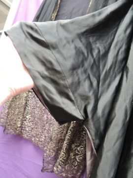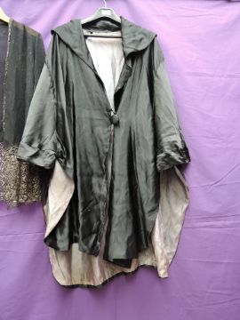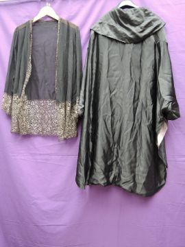 A coat or cover up in black satin lined in blue silk with singular button fastening and shawl collar and a crepe georgette and lace cover up,both around 1930s.