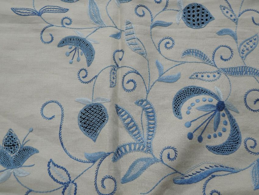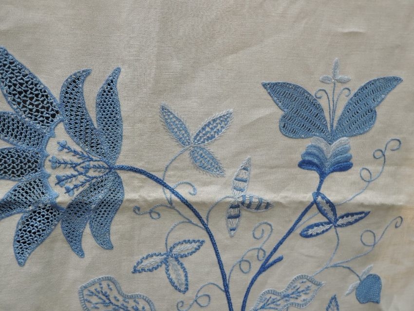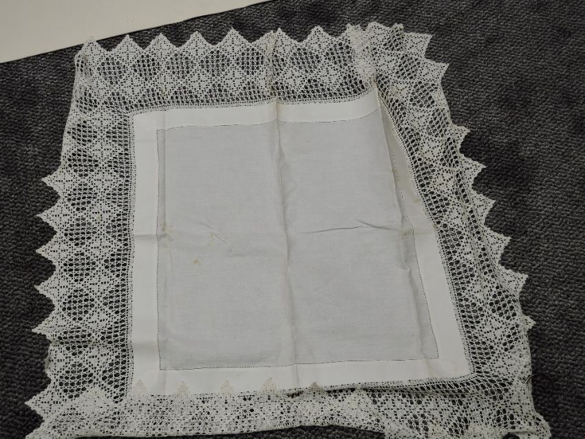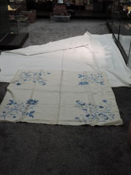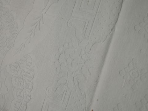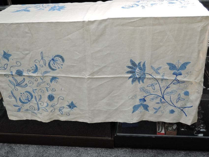 An early 20th century white bed throw and an embroidered table cloth.