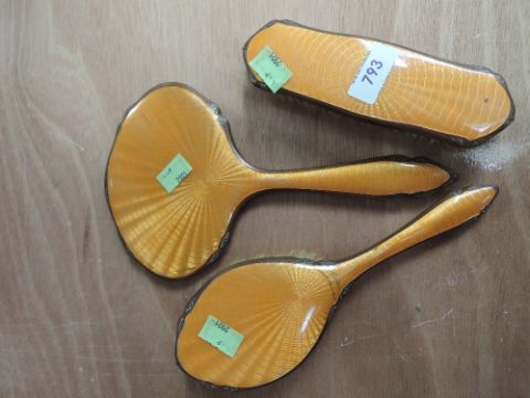 A orange guilloche backed dressing table set.