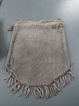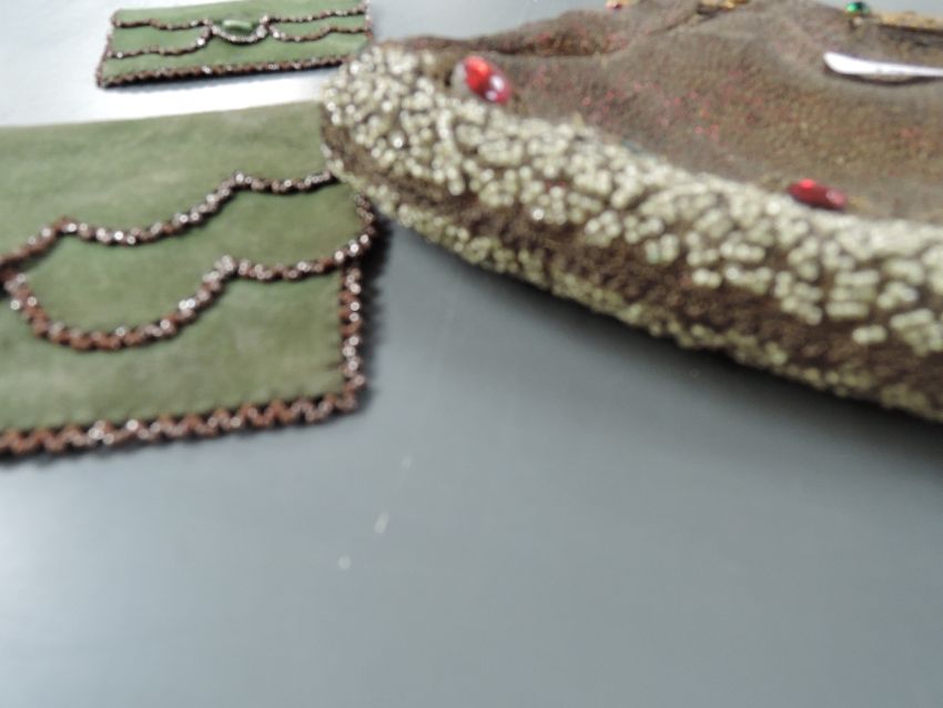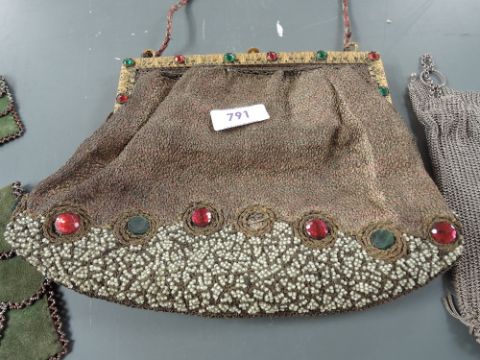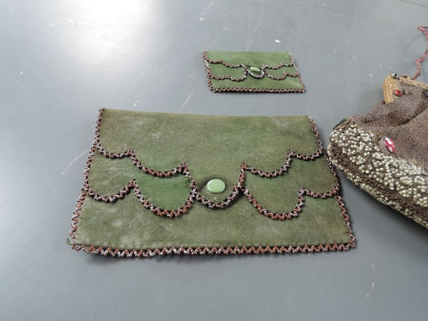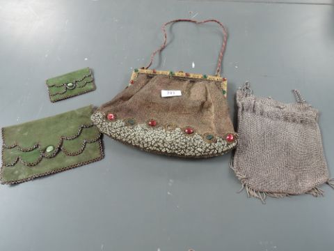 A collection of antique bags including beaded bag with metal threadwork, chain bag and green suede clutch bag with pusre.