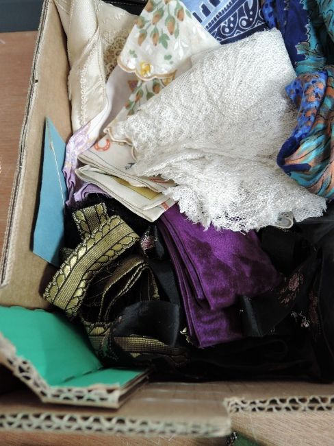 A selection of vintage and antique gloves,fabric, ribbons,handkerchiefs and more.