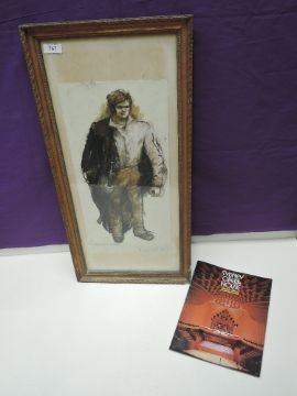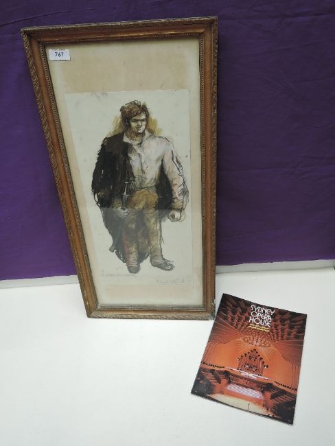 A costume painting by Michael Stennett,1967, of the intruder, Fete Champetre. First designer of costumes for the New Sydney Opera House, also included is a brochure about the actual building of it.