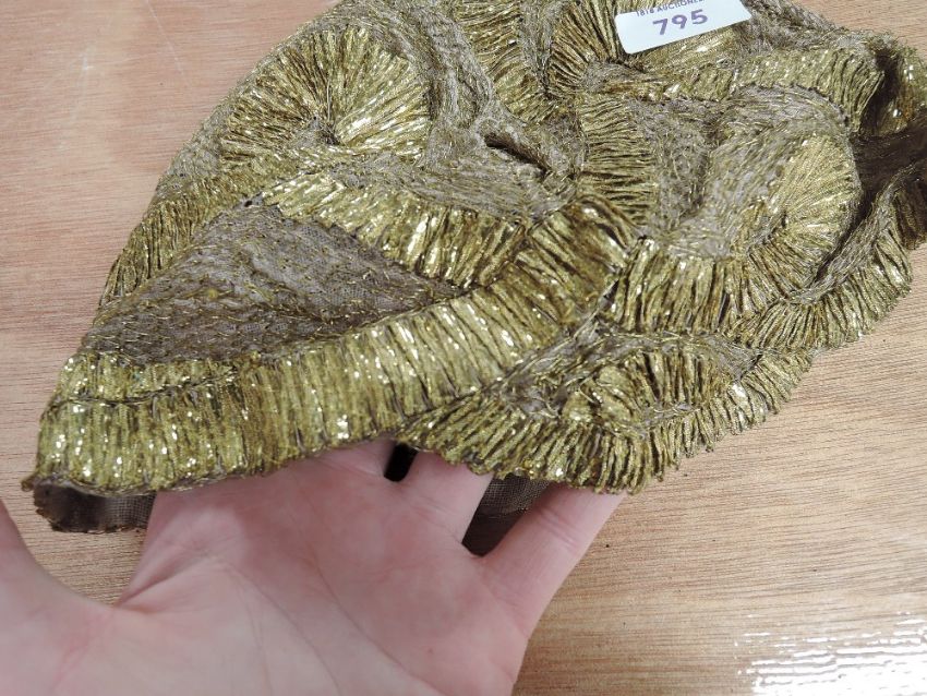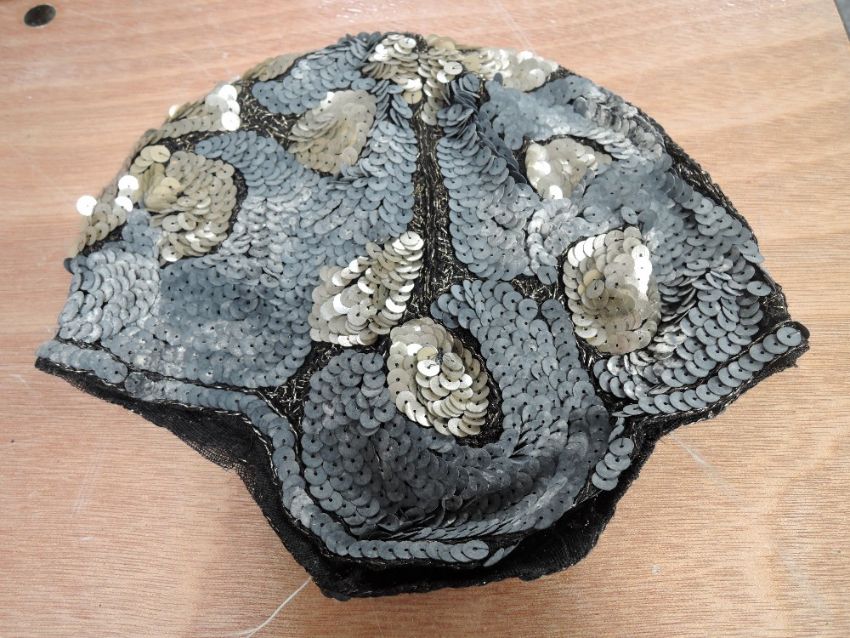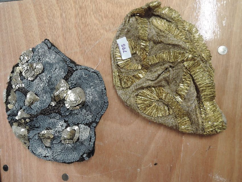 Two flapper caps, one having metallic gold thread work and the other of black and silver sequins.