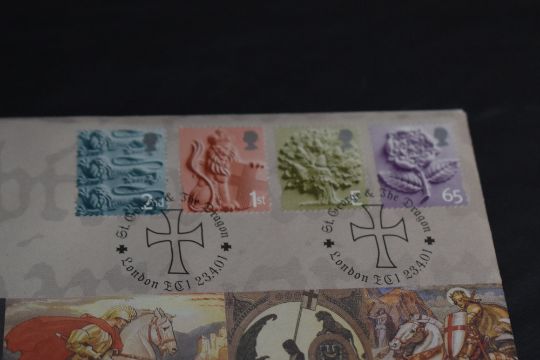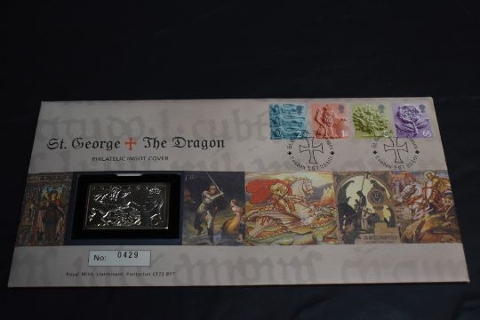 GB 2001 ST GEORGE & DRAGON COVER WITH SILVER INGOT + ENGLAND DEFINITIVES Set of four England definitives from 2001 with silver ingot. Ingot depicts 10/- Festival high value. Hallmarked to rear, weighs apx 24gms