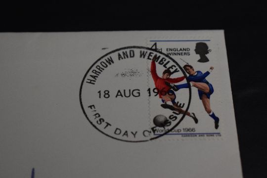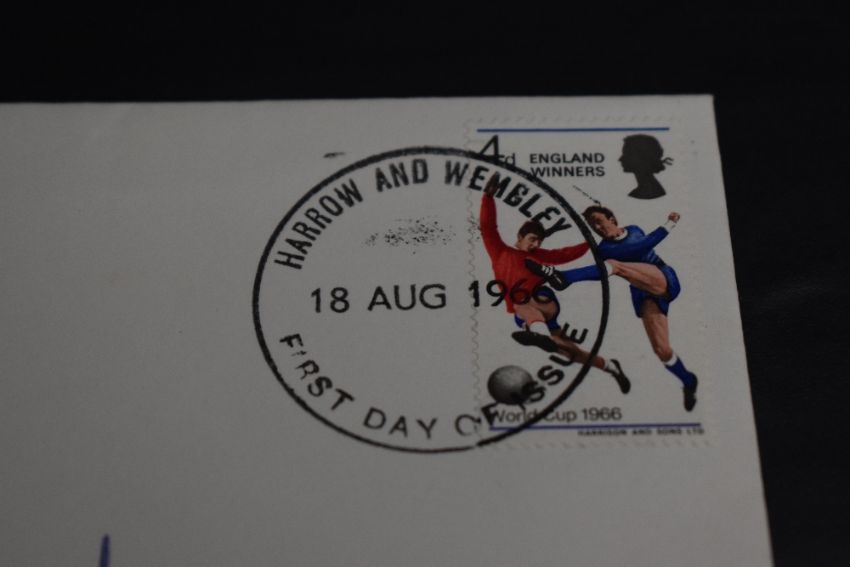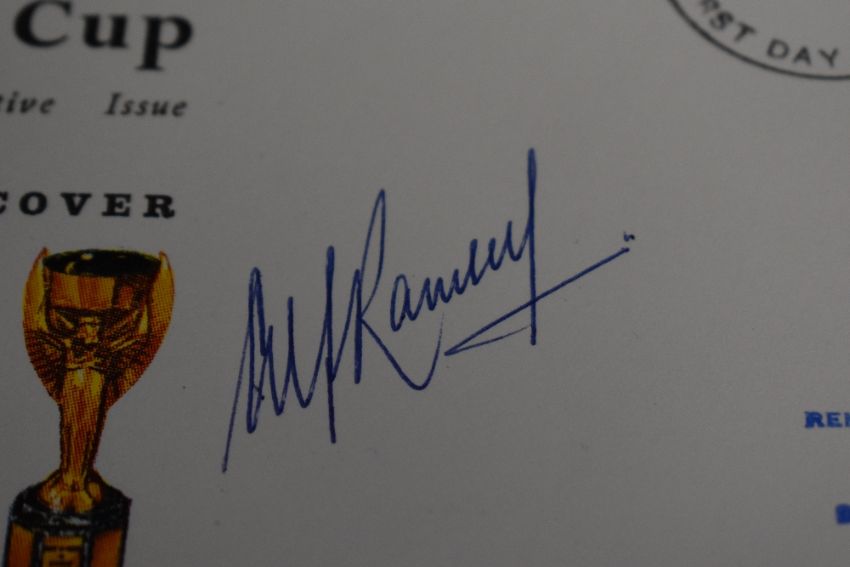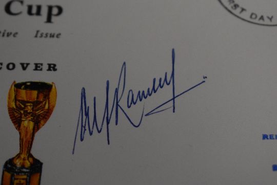 GB 1966 WORLD CUP WINNERS FDC, SIGNED IN INK BY ALF RAMSEY 1966 England Winners illustrated first day cover, with Harrow & Wembley FDI ring cancel. Cover signed in blue ink by Alf Ramsey. Fine cover.
