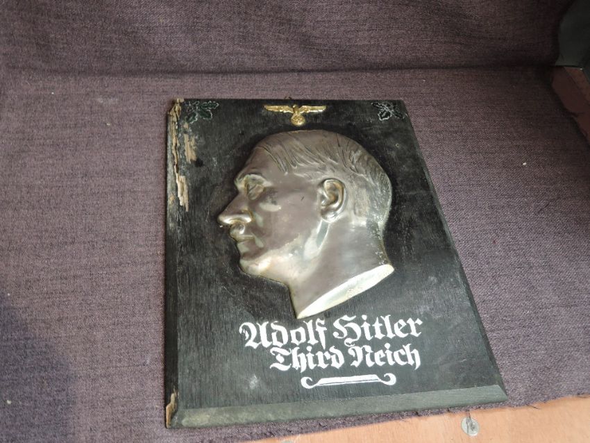 A wooden plaque having Silvered Head of Adolf Hitler, marked to neck HB in circle, underneath named Adolf Hitler Third Reich above head an eagle badge holding orb