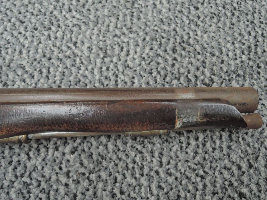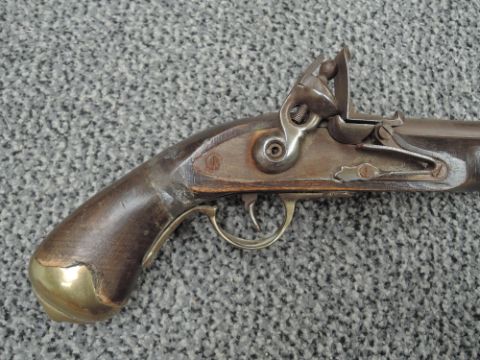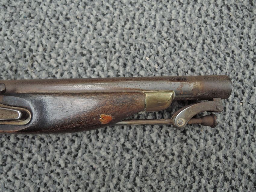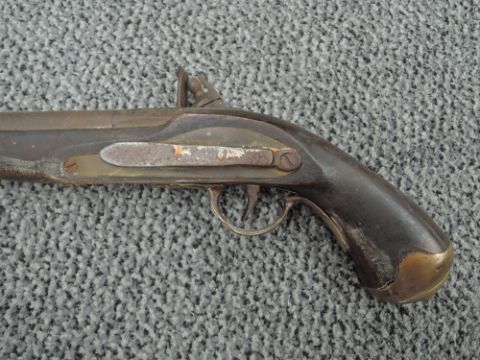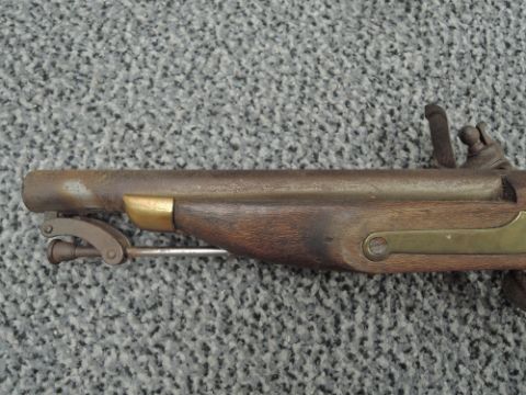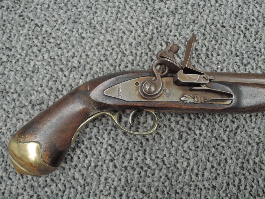 Two Flintlock Pistol, first being a Belt Pistol with ram Rod, brass butt, no marking seen, second having swing ramrod, marked Tower with GR Crown, brass butt