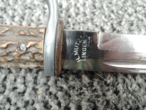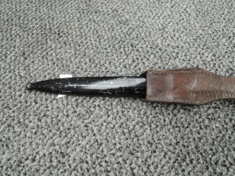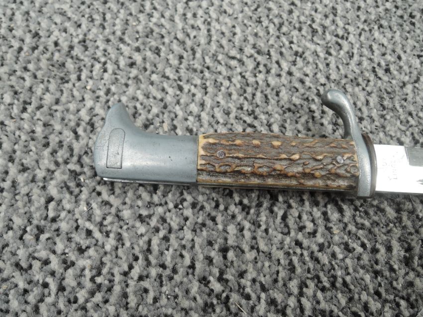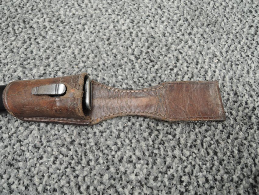 A German WW2 Dress Bayonet, blade inscibed'Zur Erinnerung an meine Dienstzeit' (In memory of my time of service) and Oak leaves, Eagle with Swastika in talons having horn handle,on reverse marked H.MUTZ. Lingen, pommel with oak leaves with eagle having swastika in talons, blade length 19cm, overall length 32cm, with black metal scabbard and brown leather frog