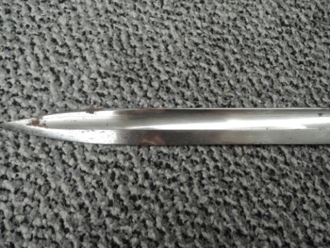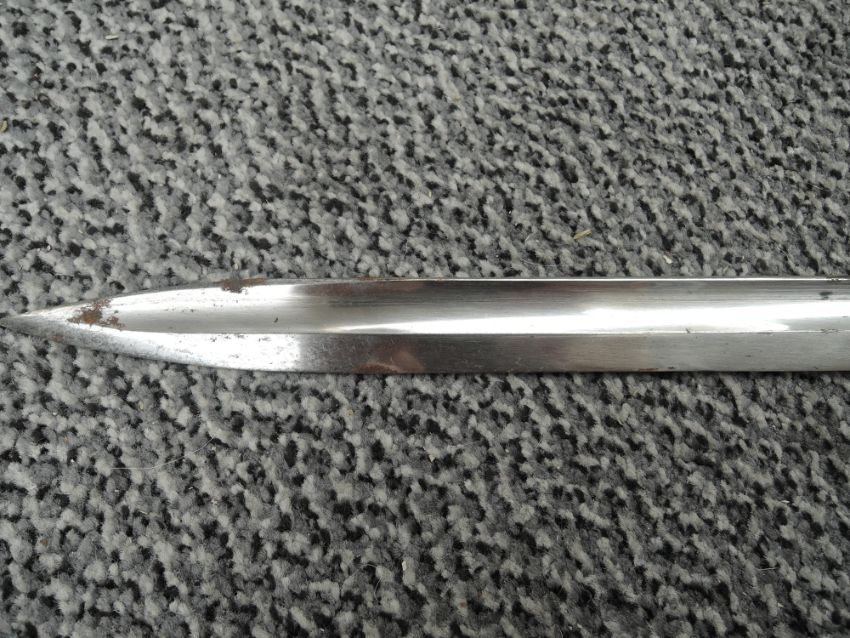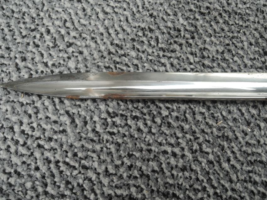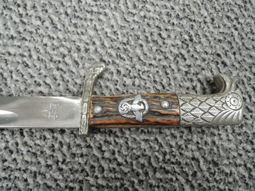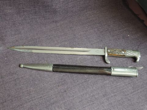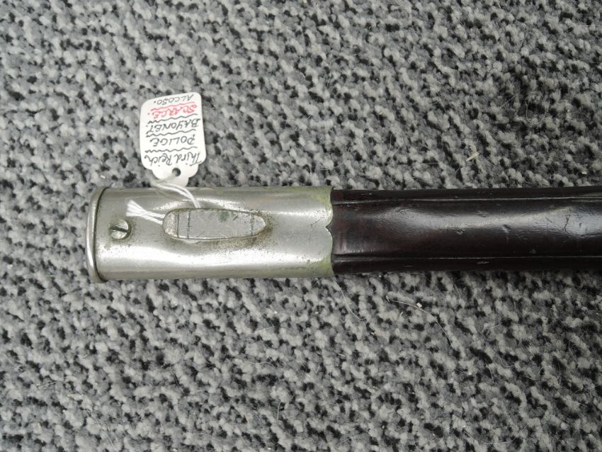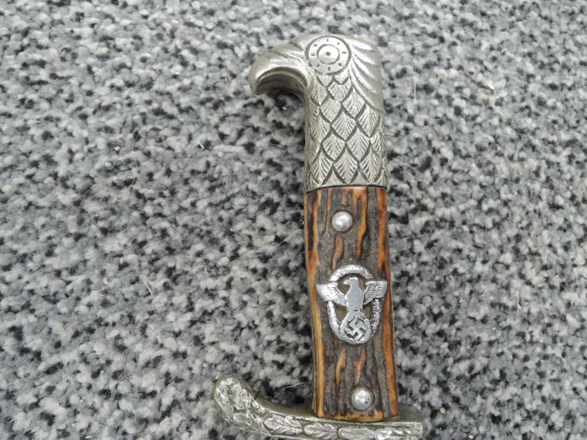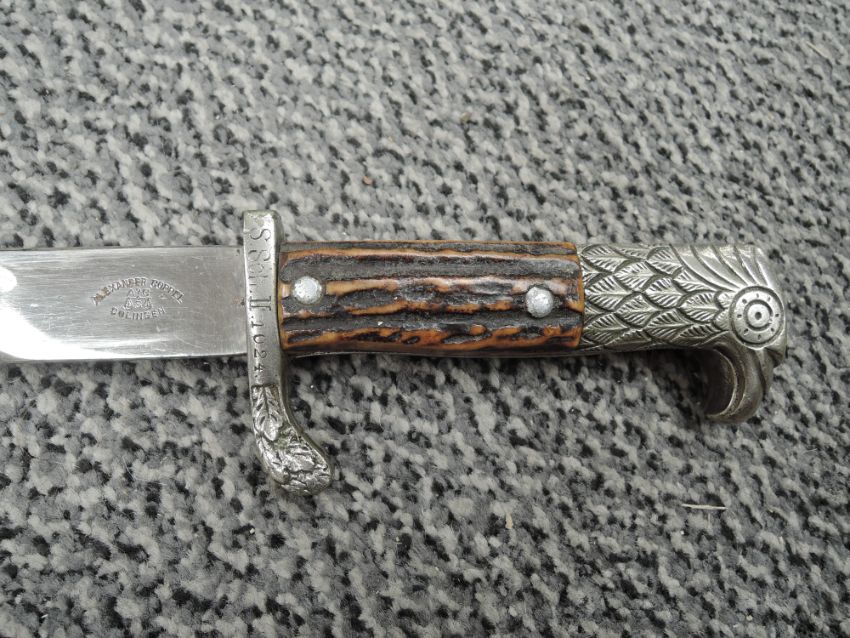 A German WW2 Police Bayonet having single edge blade, blade length 33cm, marked ACS with a pair of scales, on reverse marked M.EXAMBER Coppel, Solingen, horn grip with eagle head, inscribed on guard S SCH 11 1024, leather & metal scabbard marked the same as blade, overall length 45cm