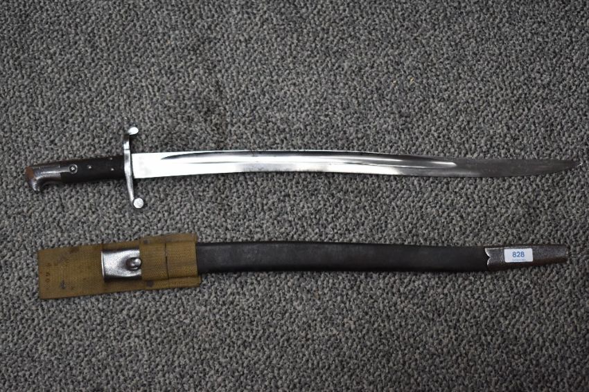 A British Bayonet 1856 Pattern for the Enfield Rifled Musket of the Crimea War Period, steel Pommel and Cross Guard, 58cm recurved blade, leather & metal scabbard, overall length 72cm