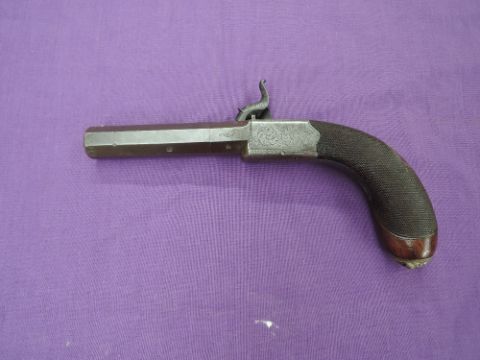 A 19th century Turn Barrel Percussion Pocket Pistol having hexagonal barrel by T Conway Manchester having proof marks under barrel, fold away trigger and safety catch, wooden chequered grip handle
