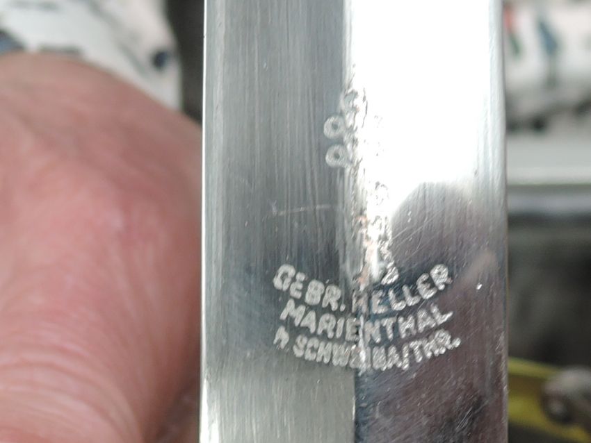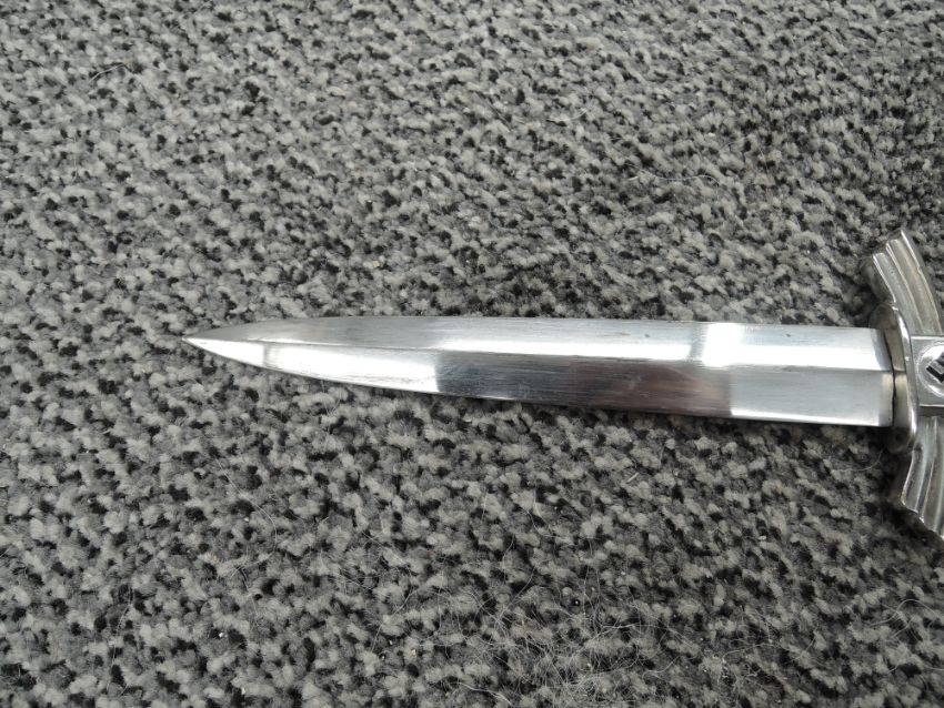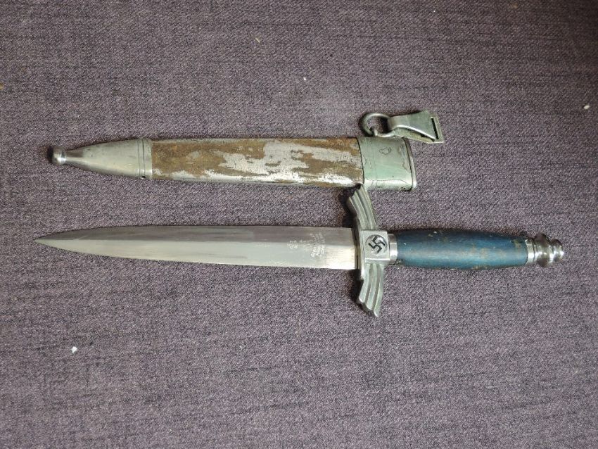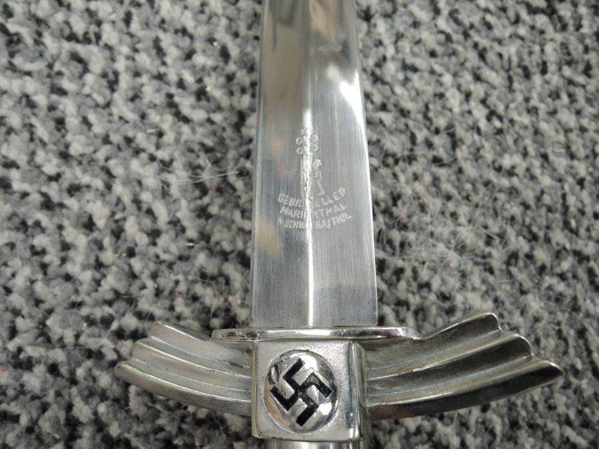 A WW2 DLV German Nazi Glider pilot dagger with scabbard, blade marked GEBR HELLER, Marienthal, Eischwemiaithr?, blade length 17.5cm, overall length 30cm