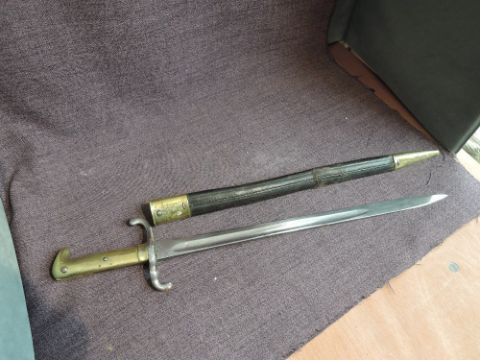 A German Seitengewehr M1871 Bayonet for the First Mauser Rifle, brass Hilt, 40cm Blade, blade marked GEBR WEVERSBERS Solingen, leather & metal scabbard 89.R.3.6.8 on scabbard, overall length 59cm