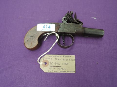 A 18th/19th century Flintlock Pocket Pistol, screw off barrel, 50 bore possibly by John Jones & Son, shield and flag decoration to lock plate